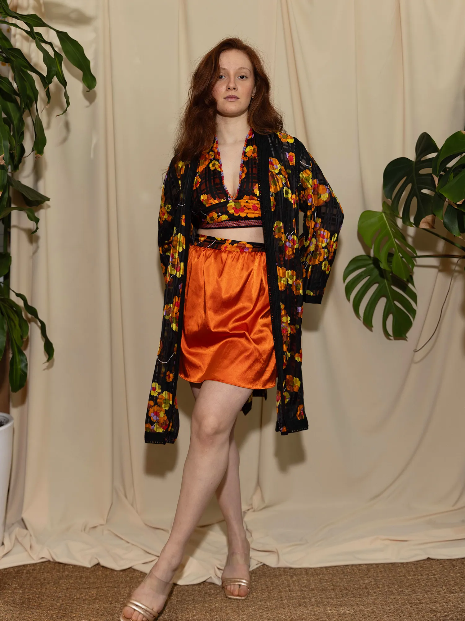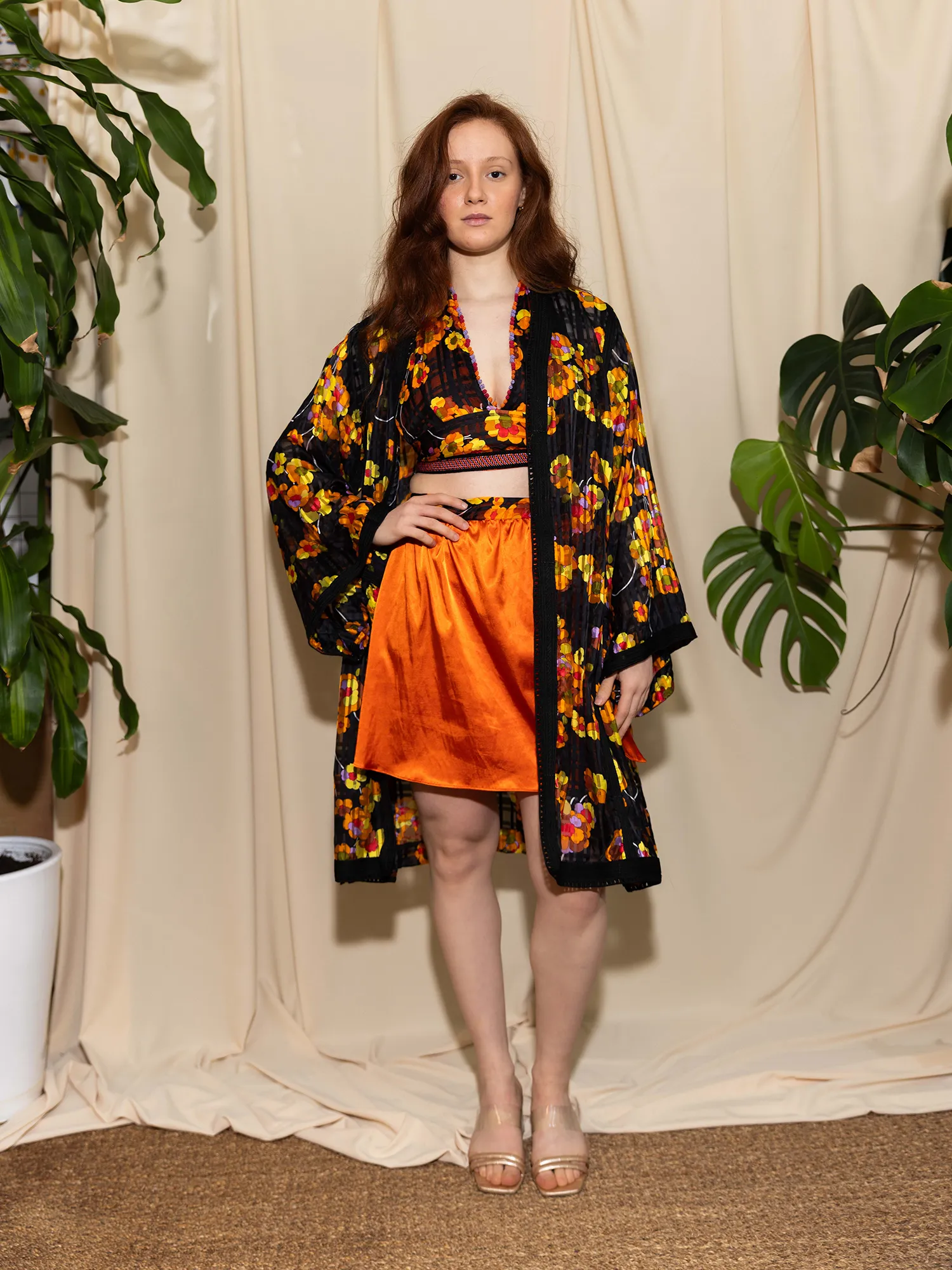 The crop top highlights the vibrancy of the floral weave, sculpted into a modern, structured silhouette that contrasts with the fluidity of the over-top.