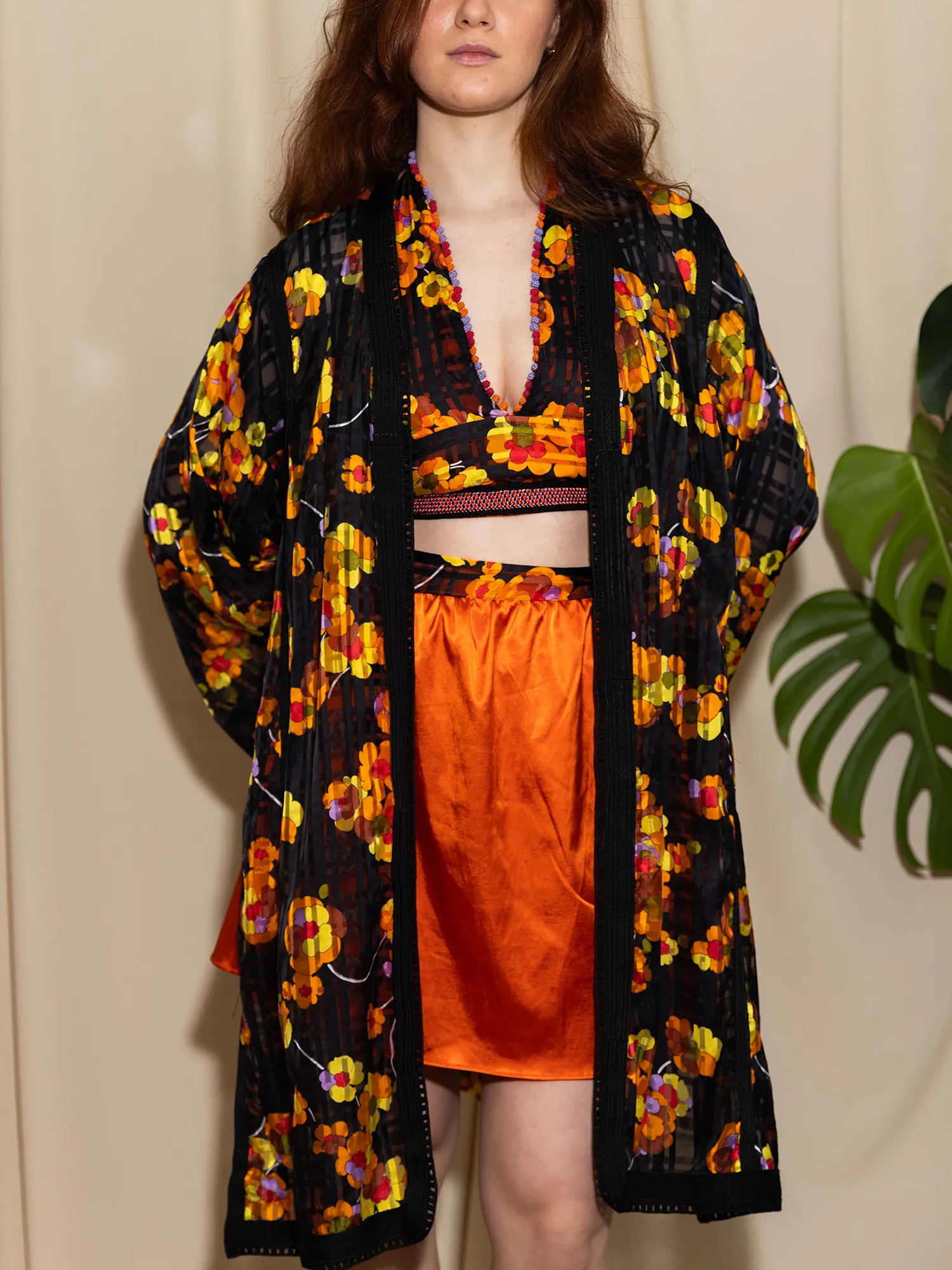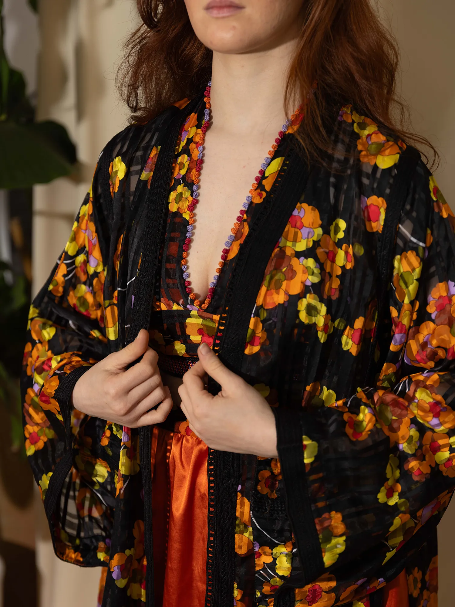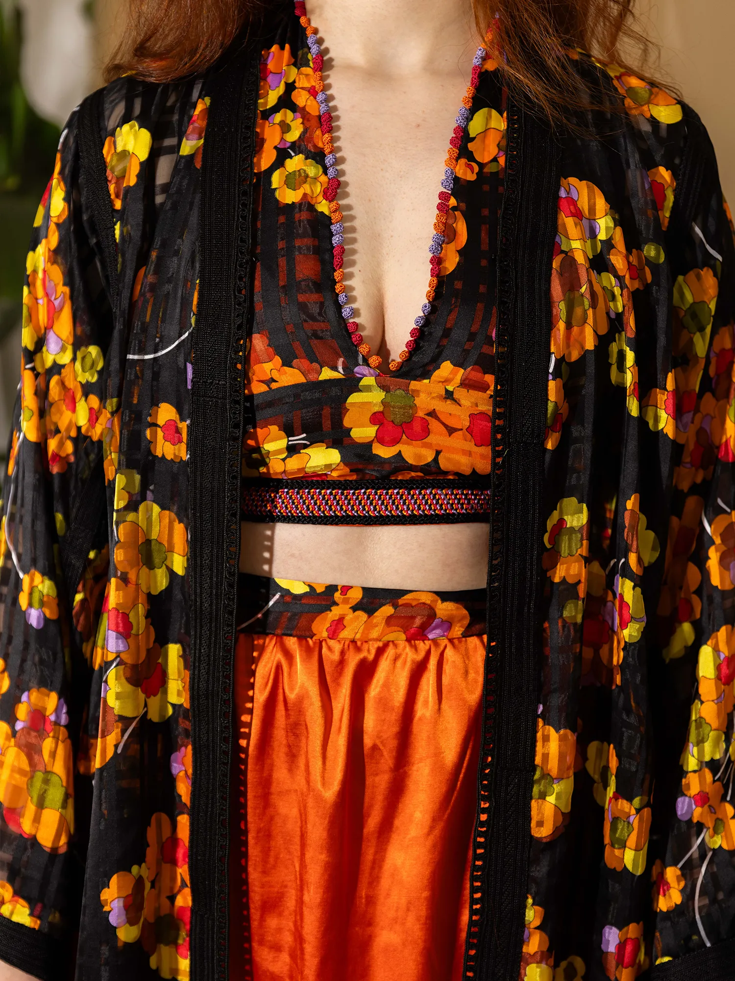 Autumn Hibiscus unfolds from an archival floral textile whose vivid saffron, amber, and deep black tones echo the warmth of late-season blooms. The over-top preserves the integrity of the original garment, kept in its authentic Moroccan cut and framed with its vintage sfifa — a quiet tribute to the hands that shaped it decades ago.