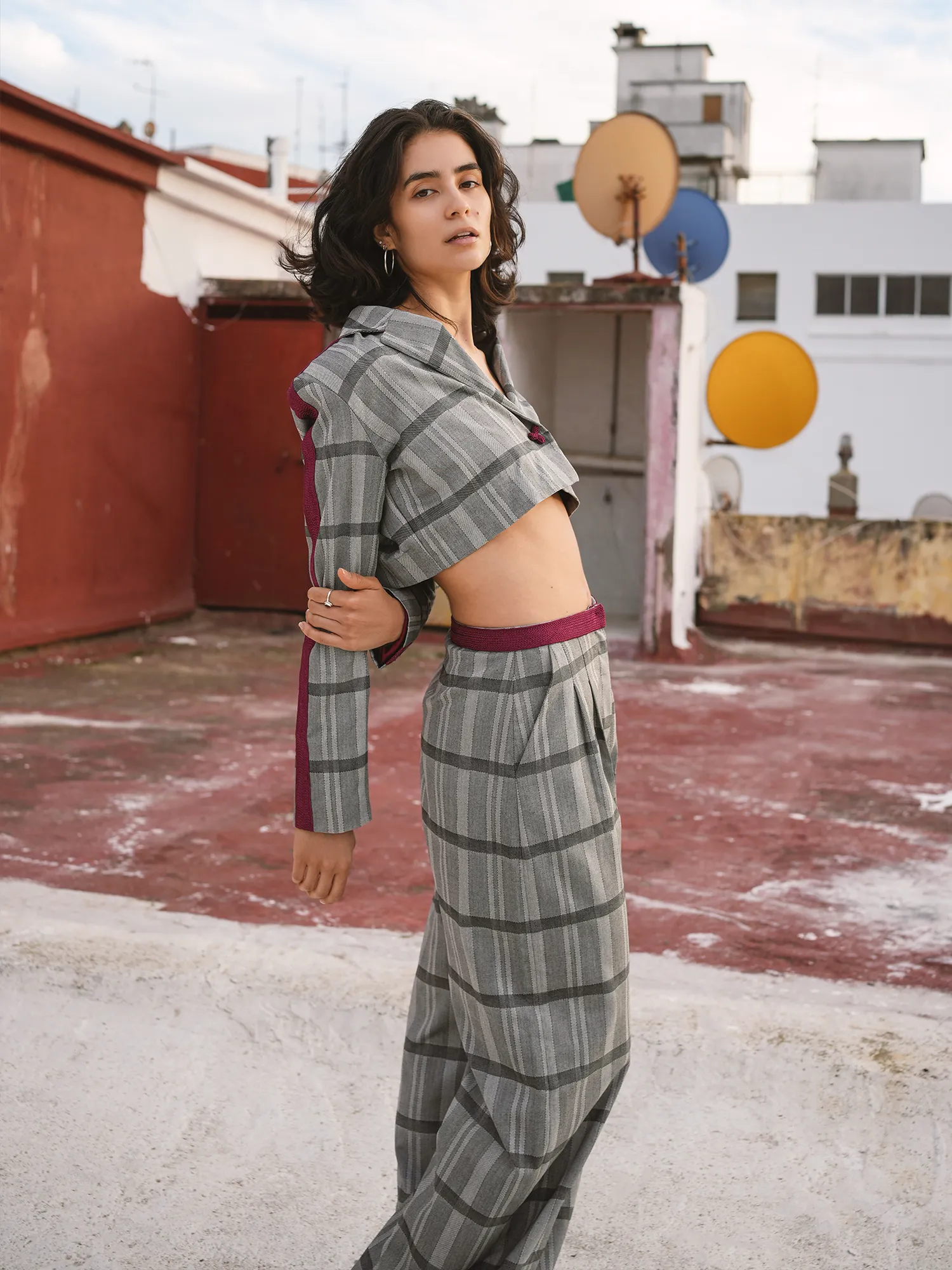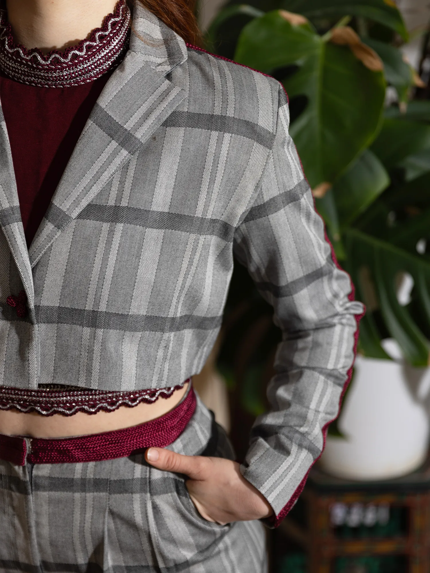 Breaking with convention, the blazer is cut short and finished with burgundy sfifa tracing the arms and shoulders. This gesture introduces Moroccan artisanal language into a traditionally rigid tailoring code. The result is a silhouette that balances exposure and authority, inheritance and freedom.