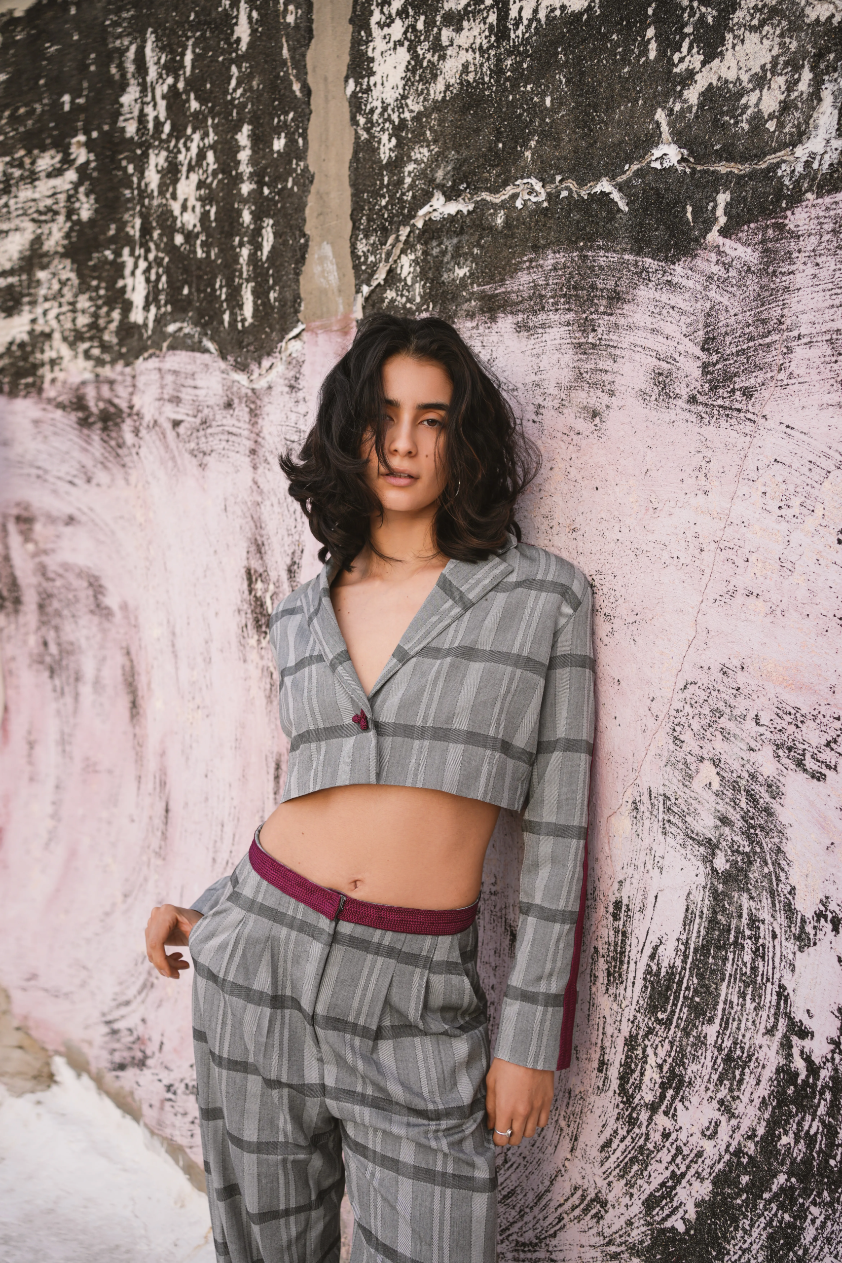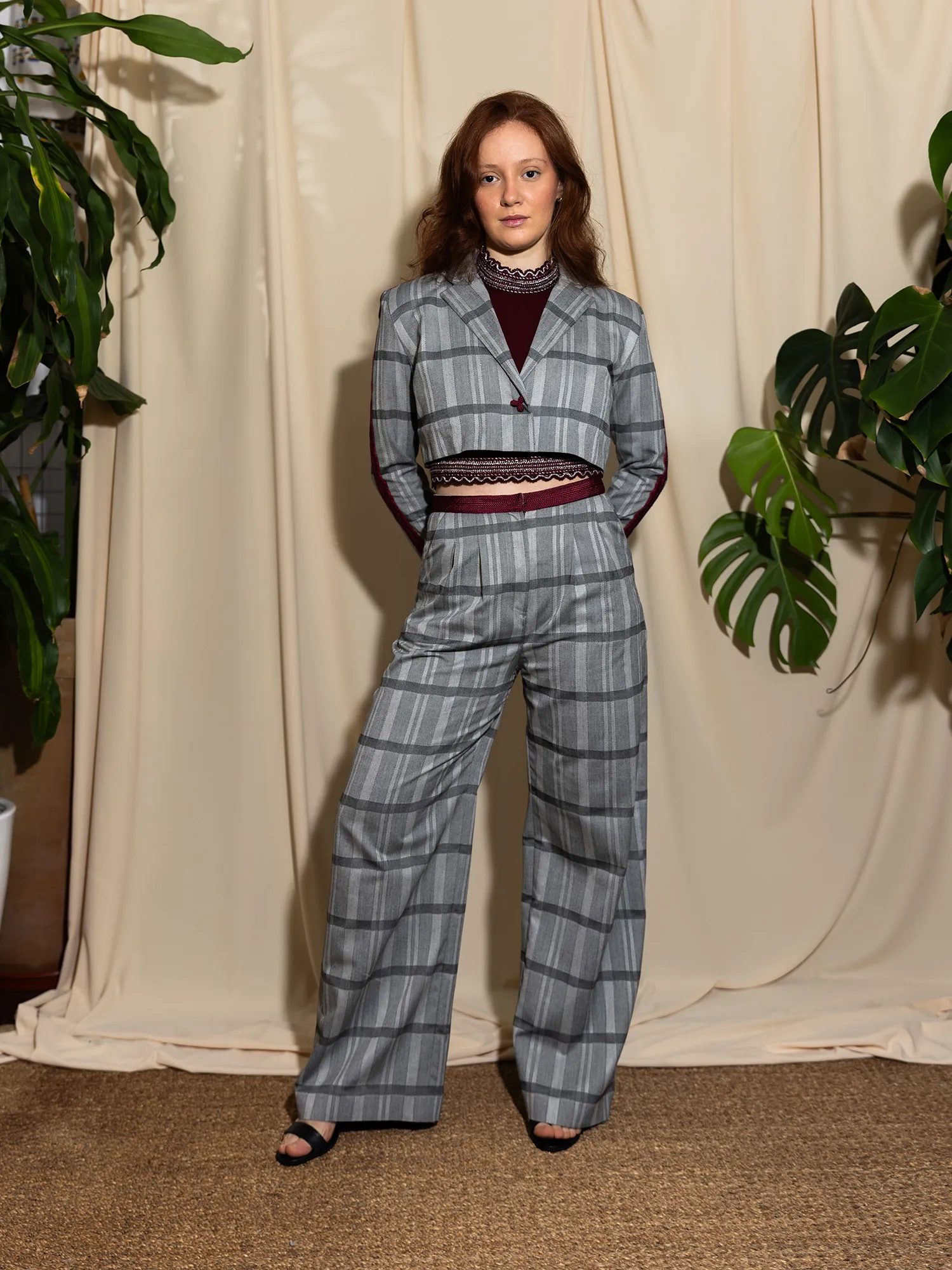 The suit is crafted from a vintage European wool suiting fabric, likely a Glen check, historically used in classic French and British tailoring. The trousers draw inspiration from early menswear, with a high waist and pleated wide-leg cut. Oversized yet structured, they allow movement while maintaining form and presence.