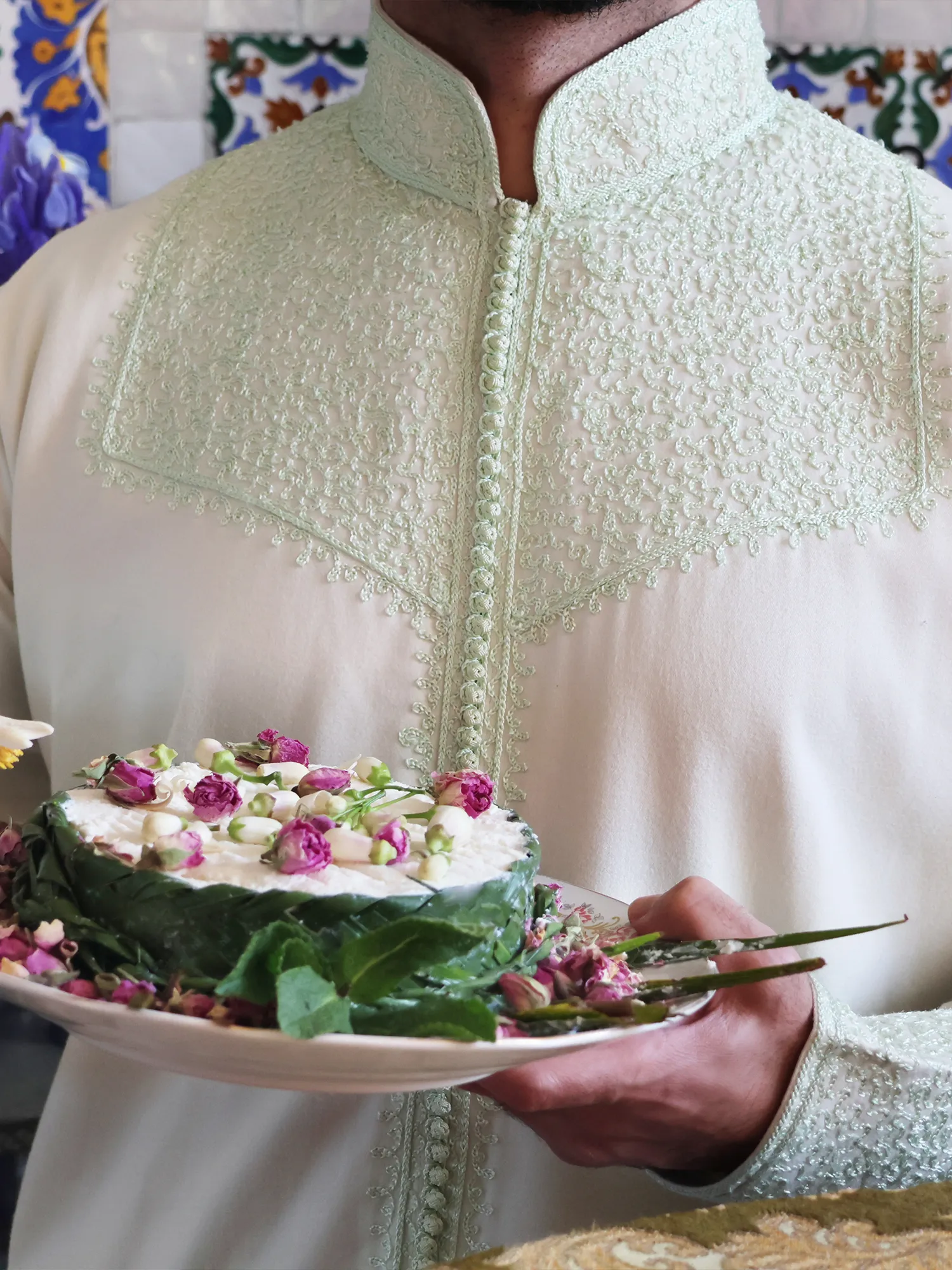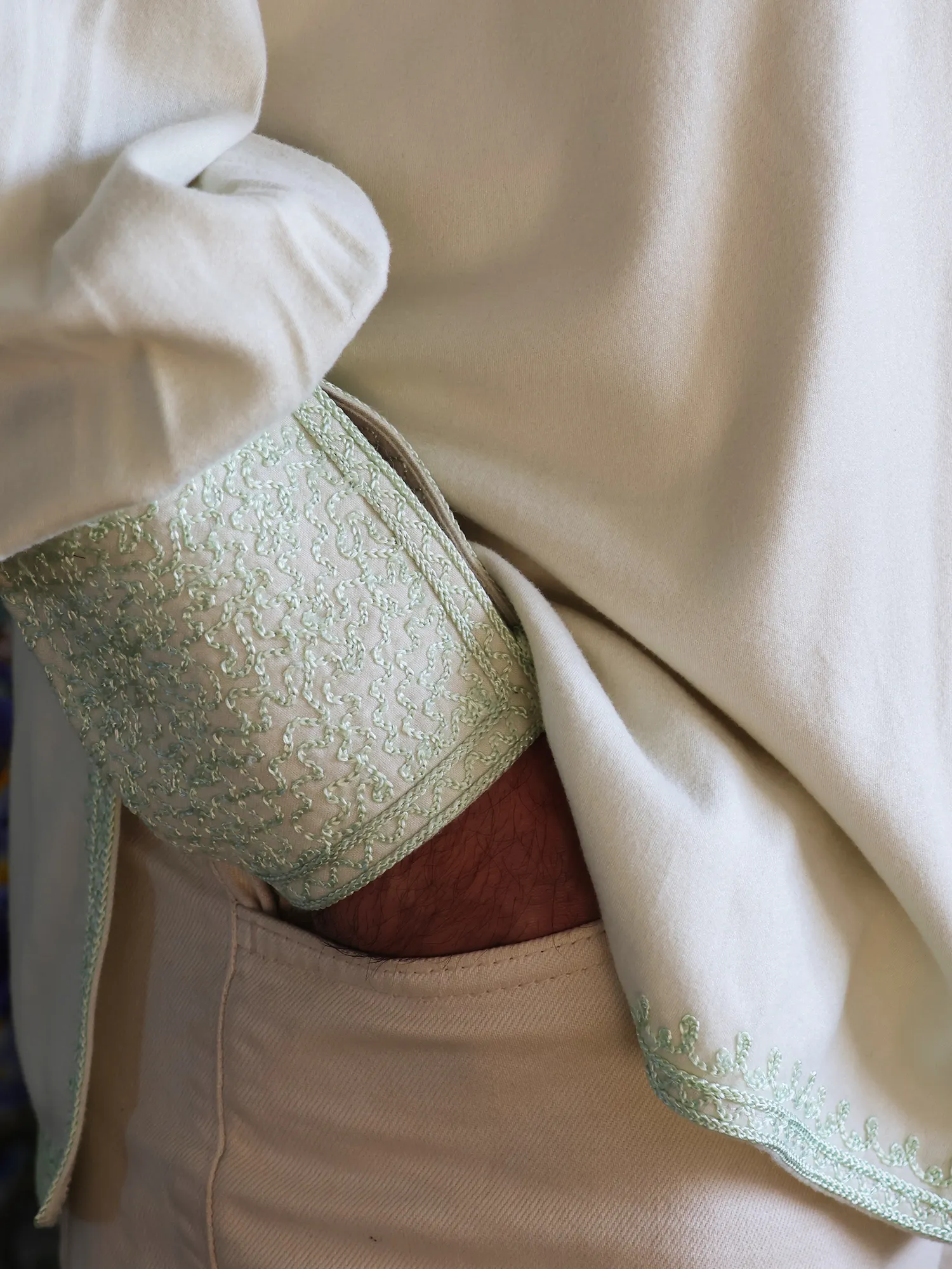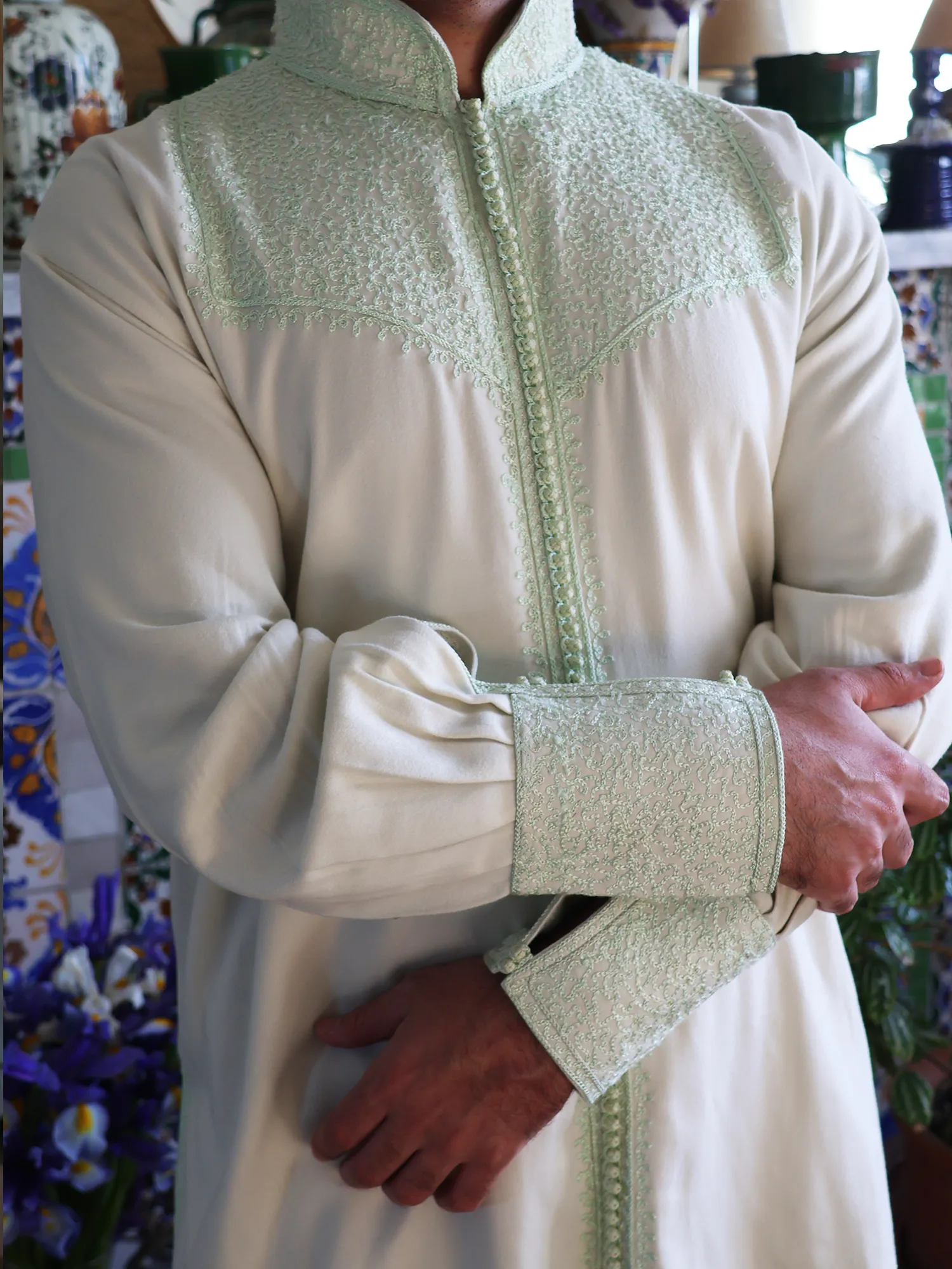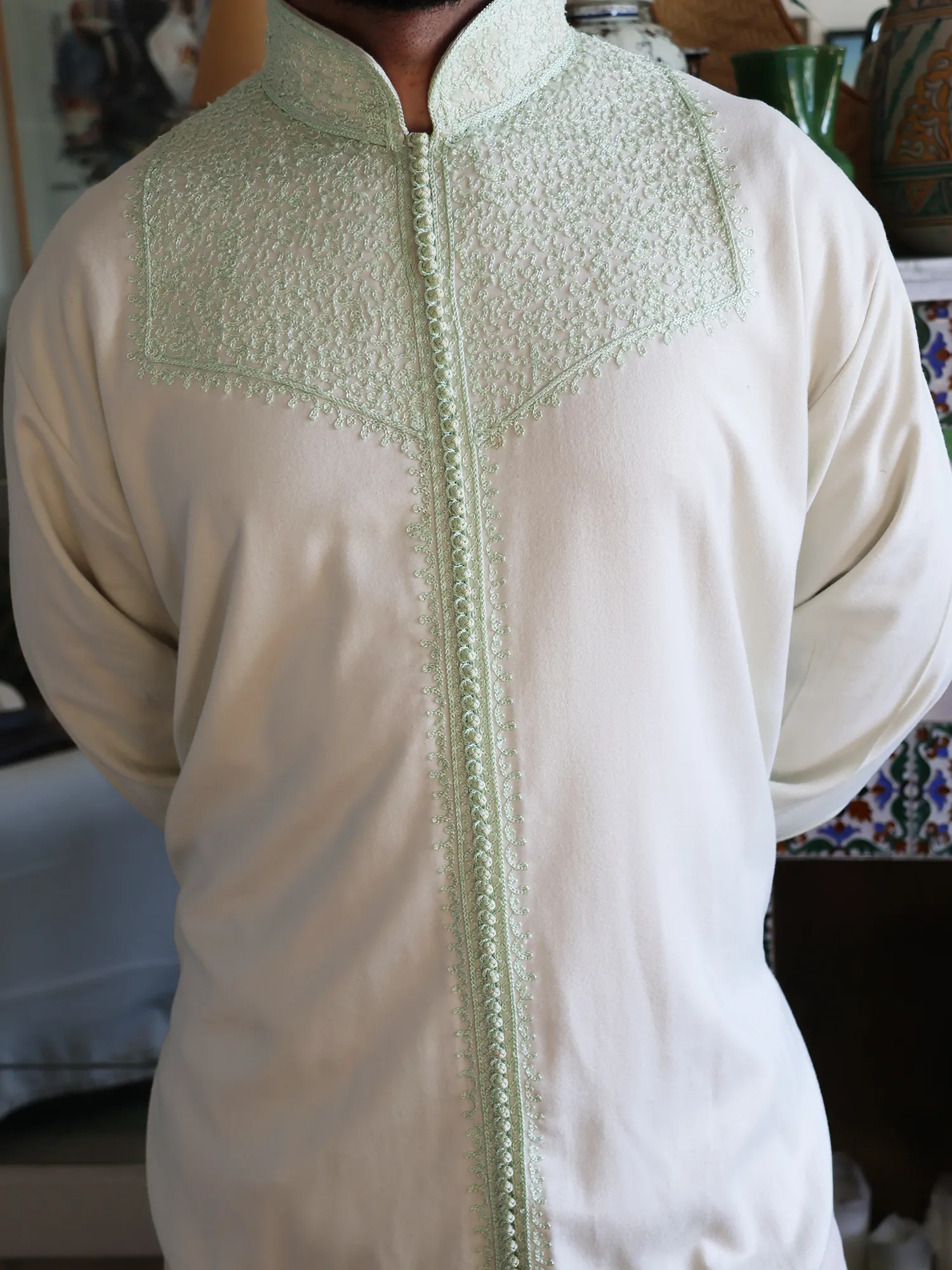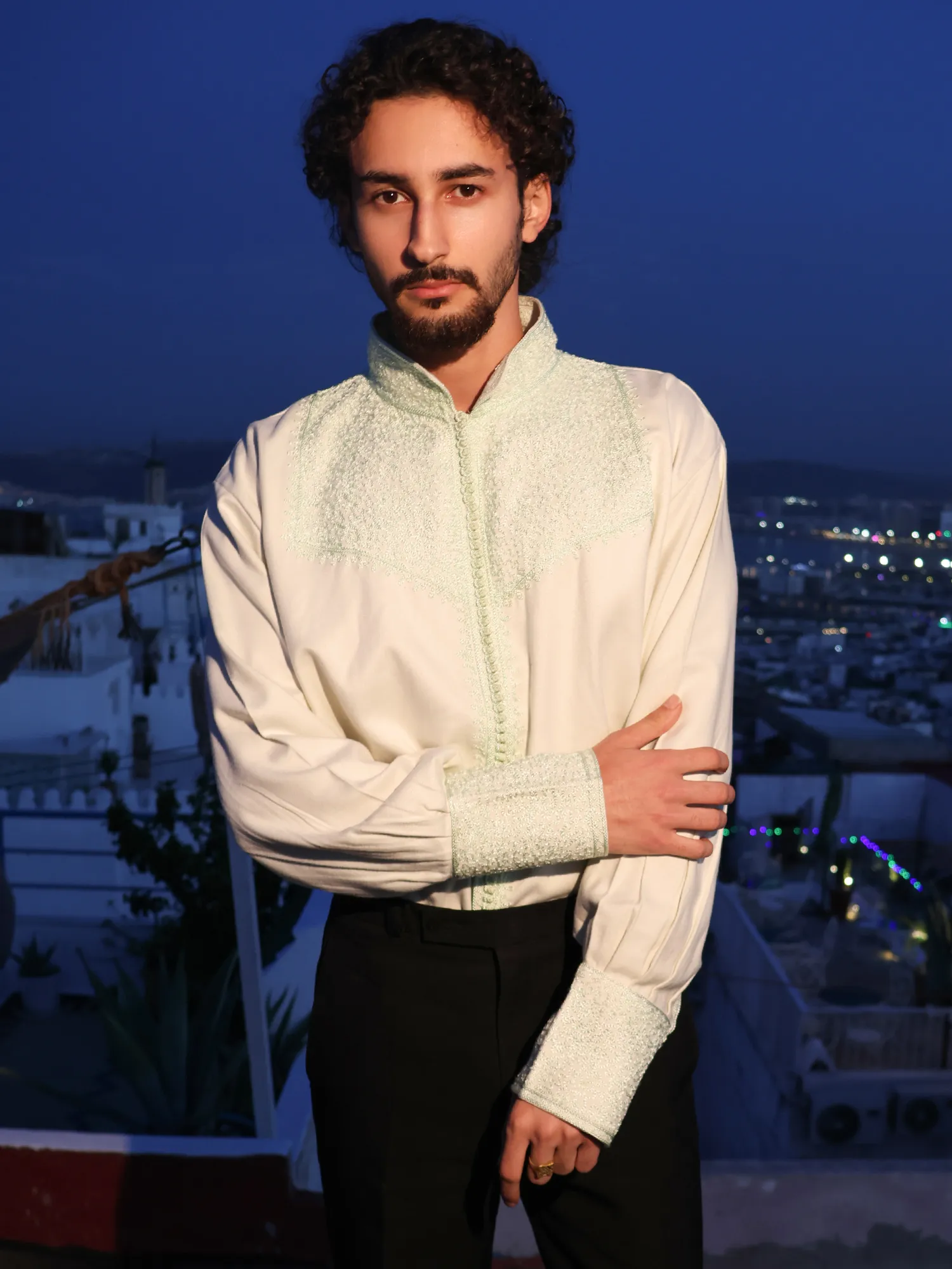 Style:Wear it freely, without rules. Layer it beneath a jelaba or selham for heritage presence, or tuck it into black tailored trousers for refined elegance. For a relaxed look, wear it untucked over denim or a skirt, leaving a few buttons open. For women, bold earrings without a necklace allow the embroidered neckline to remain the focal point.