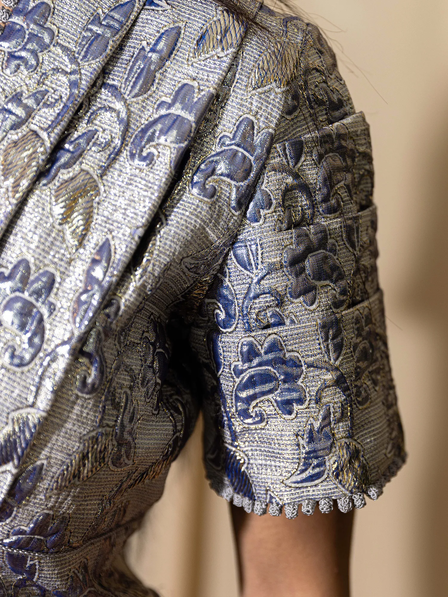 Selene is a one of a kind dress envisioned as the lunar counterpart to SHAMS. Crafted from a vintage metallic brocade in a pale silver tone, the fabric captures light softly, reflecting it rather than demanding it, like moonlight resting on stone.